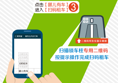 智能手機(jī)用戶點(diǎn)擊支付寶app,在“服務(wù)窗”內(nèi)搜索添加【城市公共自行車】,并進(jìn)入【城市公共自行車】頁面;點(diǎn)擊“哪兒有車”中選擇“掃碼租車”;掃描鎖車柱上的掃碼租車專用二維碼,按提示操作即可輕松租車,流程簡單便捷。