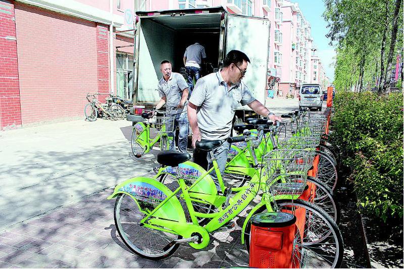 圖為黑河市公共自行車(chē)管理中心工作人員正在為新增站點(diǎn)投放自行車(chē)。