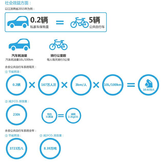 而從社會效益方面來看,江浙兩省2015年的人均私家汽車保有量為0.2輛;以每5人騎公共自行車代替1輛小汽車出行為例,按照每人每天騎行3公里;小汽車百公里10升耗油量計算,則永安公共自行車系統(tǒng)每天為全社會節(jié)省燃油10.02萬升(0.2×167萬人次×3公里/人次×10升/100公里),相當(dāng)于每天減少二氧化碳排放230噸(節(jié)約1升燃油=減排2.3千克二氧化碳)。永安公共自行車系統(tǒng)全年為全社會節(jié)省燃油3723萬升汽油,相當(dāng)于減少8.39萬噸的二氧化碳排放。