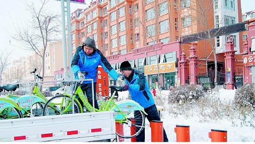 由于氣溫急劇下降,降溫降雪導(dǎo)致路面結(jié)冰,為確保使用公共自行車的市民人身安全,市公共自行車管理中心于11月14日停止運營市區(qū)公共自行車,開始陸續(xù)回收市區(qū)90處站點的2530輛公共自行車,工作人員將進行檢修和維護,以便明年春季繼續(xù)投入使用。據(jù)統(tǒng)計,公共自行車自2012年投入使用以來,市民共借還公共自行車輛達3160萬次,其中今年借還700萬次。圖為工作人員回收公共自行車入庫。本報記者李天嬌攝《黑河日報》