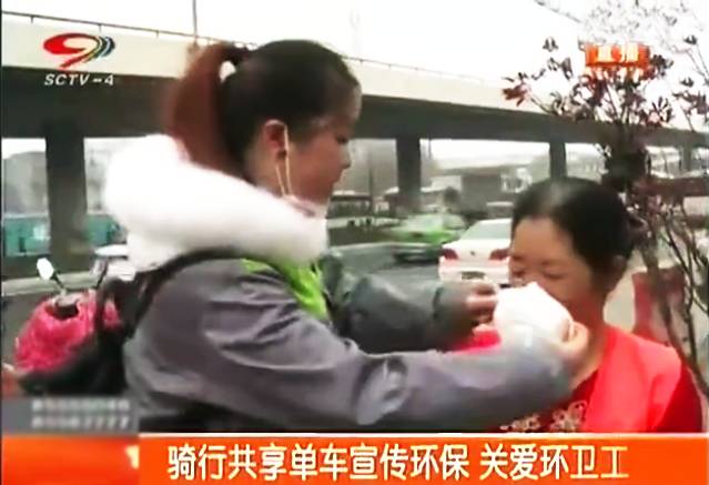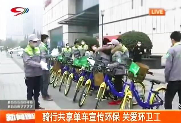 志愿者:“給一線比較辛苦的環(huán)衛(wèi)工人贈送口罩,提倡大家減少用車出行,多騎自行車,同時也是希望大家給更多的關(guān)心與關(guān)愛給環(huán)衛(wèi)工人?!?/p>