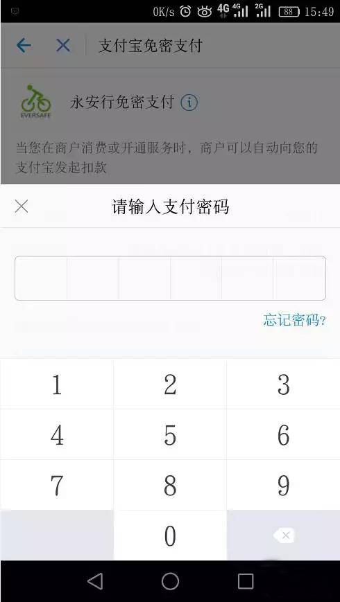 會(huì)出現(xiàn)一個(gè)設(shè)置支付密碼的界面。這是為了確保超過(guò)1小時(shí)后,公共自行車(chē)向支付寶發(fā)起自動(dòng)扣費(fèi)。正常填寫(xiě)就好。