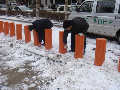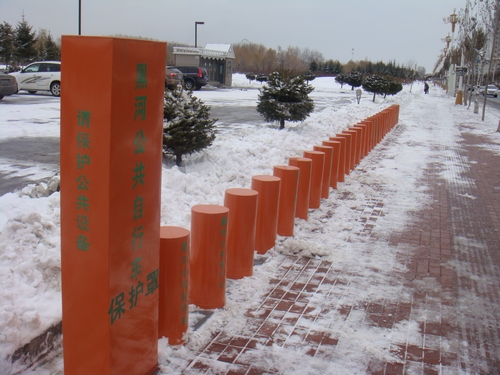 2012年11月10日,黑河市公共自行車62個站點(diǎn)冬季保護(hù)罩全部安裝完成。鮮艷的橙色保護(hù)罩給嚴(yán)冬下的黑河帶來了一絲亮麗色彩,保護(hù)罩對公共自行車站點(diǎn)的機(jī)柜、機(jī)樁起到防護(hù)作用,使明年春季公共自行車更好的投放使用,在此黑河市公共自行車管理中心呼吁廣大市民愛護(hù)公共設(shè)備。
