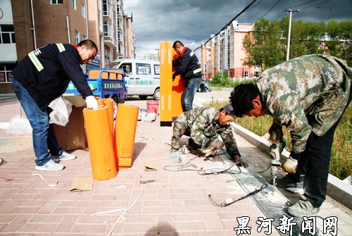 東北網(wǎng)黑河09月04日訊 8月29日,黑河公共自行車管理中心工作人員在黑河市第五中學(xué)路口進(jìn)行施工作業(yè),安裝新增設(shè)的便民自行車服務(wù)網(wǎng)點(diǎn)。